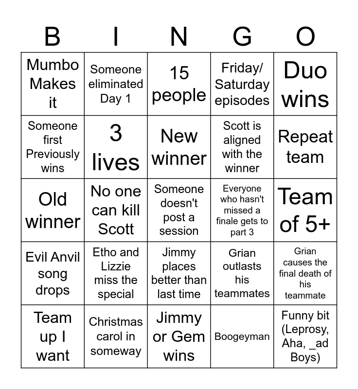 This bingo card has 25 words: Etho and Lizzie miss the special, Jimmy or Gem wins, New winner, Team up I want, Duo wins, Mumbo Makes it, Someone first Previously wins, Someone eliminated Day 1, Everyone who hasn't missed a finale gets to part 3, Jimmy places better than last time, Scott is aligned with the winner, Old winner, Grian outlasts his teammates, Grian causes the final death of his teammate, 3 lives, Funny bit (Leprosy, Aha, _ad Boys), Team of 5+, 15 people, Repeat team, No one can kill Scott, Someone doesn't post a session, Christmas carol in someway, Evil Anvil song drops, Friday/ Saturday episodes and Boogeyman.