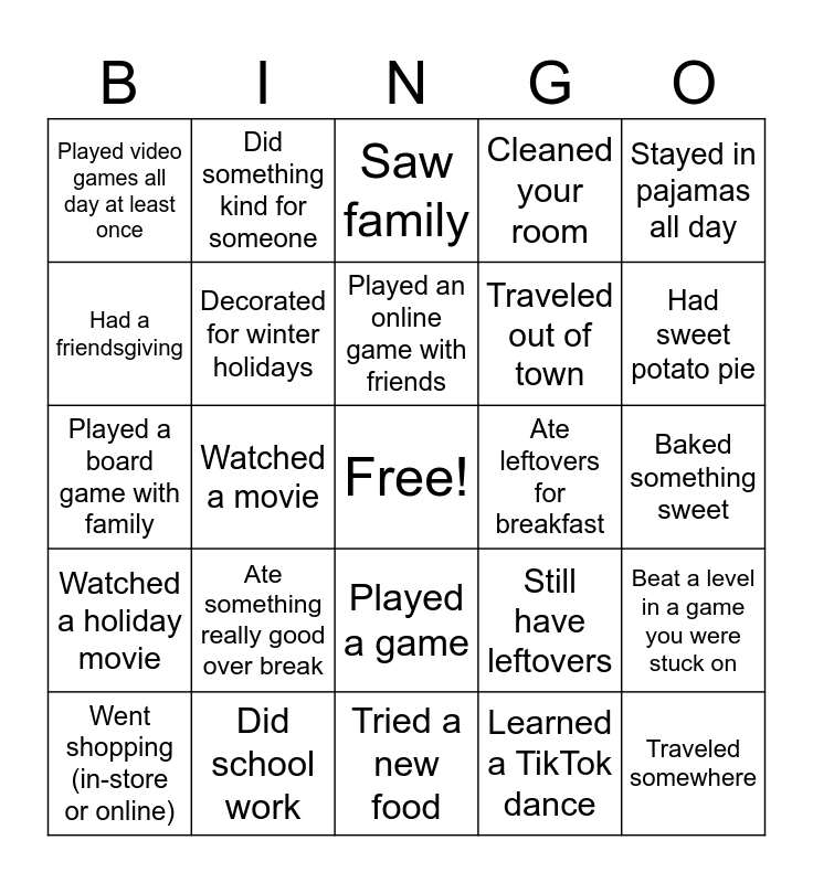 This bingo card has a free space and 29 words: Went shopping (in-store or online), Saw Extended family members, Watched a movie, Stead up until morning, Played video games all day at least once, Saw family, Decorated for winter holidays, Ate something really good over break, Ate leftovers for breakfast, Did school work, Baked something sweet, Traveled somewhere, Tried a new food, Learned a TikTok dance, Had sweet potato pie, Helped cook something, Played a game, Watched a holiday movie, Stayed in pajamas all day, Played a board game with family, Still have leftovers, Had a lazy day, Traveled out of town, Had a friendsgiving, Cleaned your room, Did something kind for someone, Beat a level in a game you were stuck on, Played an online game with friends and Saw a performance or game.