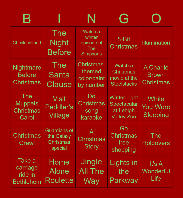 This bingo card has 35 words: Make cookies, Make a gingerbread house, Klaus, The Santa Clause, A Christmas Story, 8-Bit Christmas, Nightmare Before Christmas, Decorate apartment, Christmas-themed color/paint by number, Paint watercolors with the winter guidebook, The Muppets Christmas Carol, Illumination, Free!, Make paper snowflakes, Chriskindlmart, Winter Light Spectacular at Lehigh Valley Zoo, Lights in the Parkway, Visit Peddler's Village, Christmas Crawl, Do Christmas song karaoke, Go Christmas tree shopping, Take a carriage ride in Bethlehem, The Holdovers, Home Alone Roulette, Watch a winter episode of The Simpsons, A Charlie Brown Christmas, It's A Wonderful Life, Christmas Vacation, Watch a Christmas movie at the Steelstacks, While You Were Sleeping, Christmas chronicle (Netflix), Jingle All The Way, Guardians of the Galaxy Christmas special, The Night Before and Finish Split Fiction.
