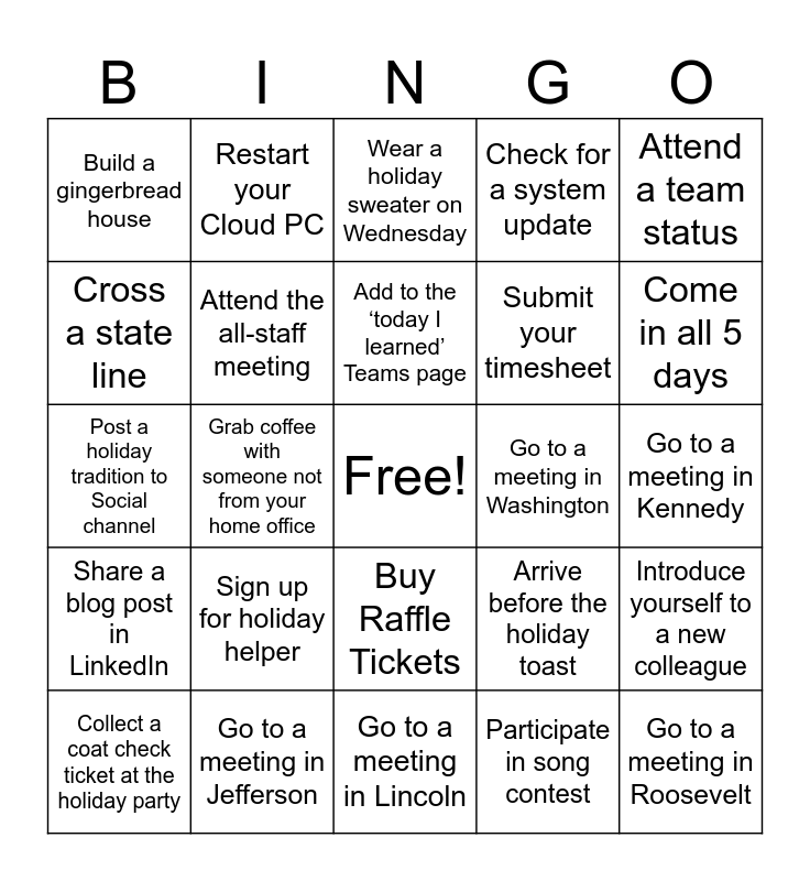 This bingo card has a free space and 29 words: Collect a coat check ticket at the holiday party, Submit a JIRA ticket for an issue, Grab coffee with someone not from your home office, Take a team picture at the holiday party, Build a gingerbread house, Wear a holiday sweater on Wednesday, Attend the all-staff meeting, Sign up for holiday helper, Go to a meeting in Washington, Go to a meeting in Jefferson, Go to a meeting in Kennedy, Go to a meeting in Roosevelt, Go to a meeting in Lincoln, Participate in song contest, Come in all 5 days, Donate a Raffle Item, Buy Raffle Tickets, Share a blog post in LinkedIn, Attend a team status, Post a holiday tradition to Social channel, Arrive before the holiday toast, Hit the dance floor, Submit your timesheet, Cross a state line, Check for a system update, Restart your Cloud PC, Introduce yourself to a new colleague, Add to the ‘today I learned’ Teams page and Ride the Metro.