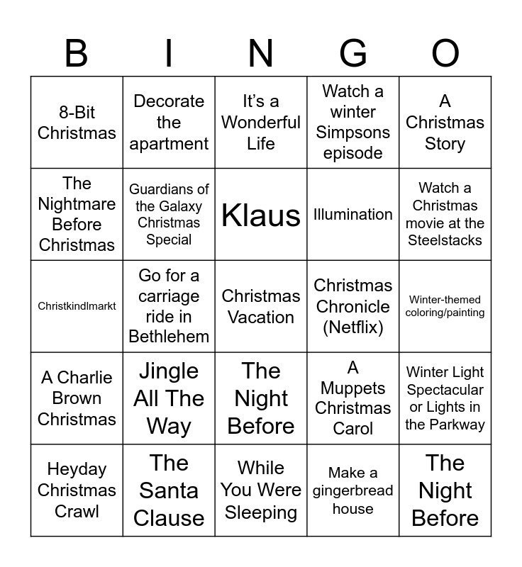 This bingo card has 26 words: The Night Before, Make a gingerbread house, Klaus, The Santa Clause, A Christmas Story, 8-Bit Christmas, The Nightmare Before Christmas, Decorate the apartment, Winter-themed coloring/painting, A Muppets Christmas Carol, Illumination, Christkindlmarkt, Winter Light Spectacular or Lights in the Parkway, Heyday Christmas Crawl, Go for a carriage ride in Bethlehem, Home Alone Roulette, Watch a winter Simpsons episode, A Charlie Brown Christmas, It’s a Wonderful Life, Christmas Vacation, Watch a Christmas movie at the Steelstacks, While You Were Sleeping, Christmas Chronicle (Netflix), Jingle All The Way, Guardians of the Galaxy Christmas Special and The Night Before.