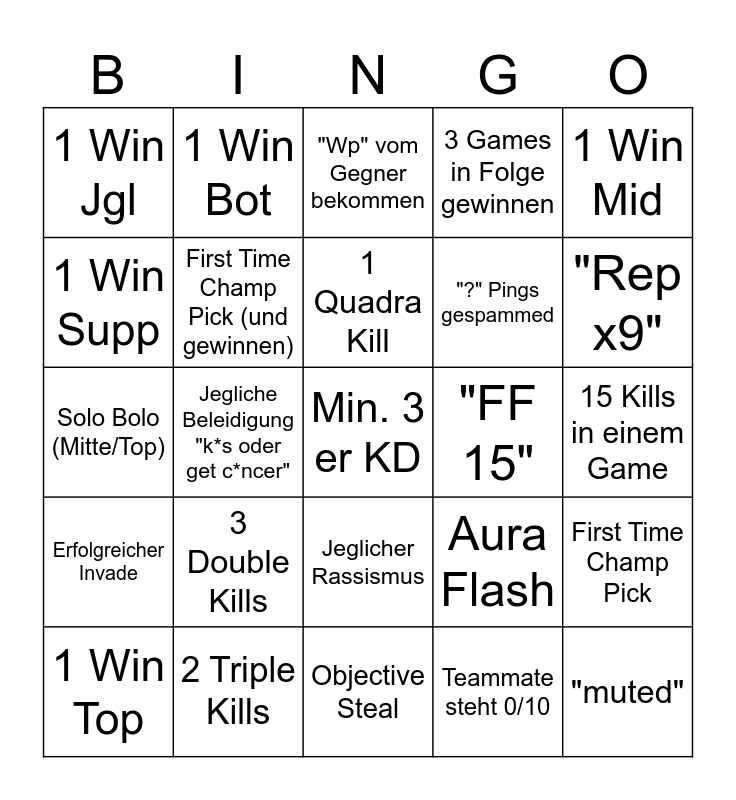 This bingo card has a free space and 24 words: 3 Double Kills, 2 Triple Kills, 1 Quadra Kill, 1 Win Top, 1 Win Mid, 1 Win Jgl, 1 Win Supp, 1 Win Bot, "FF 15", Jeglicher Rassismus, "?" Pings gespammed, Solo Bolo (Mitte/Top), Aura Flash, First Time Champ Pick, First Time Champ Pick (und gewinnen), Teammate steht 0/10, 15 Kills in einem Game, "Wp" vom Gegner bekommen, "Rep x9", Jegliche Beleidigung "k*s oder get c*ncer", "muted", Erfolgreicher Invade, 3 Games in Folge gewinnen and Objective Steal.
