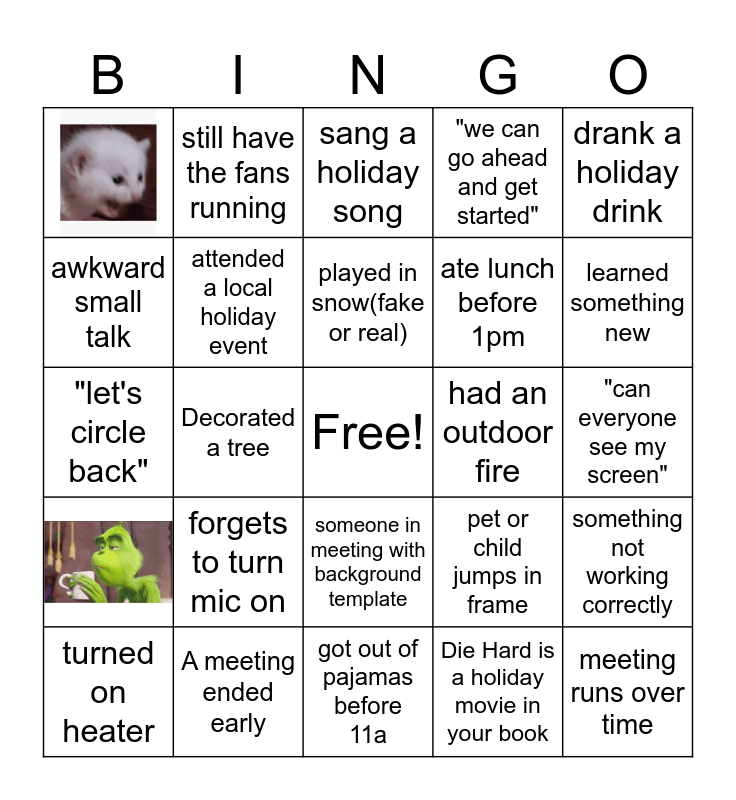 This bingo card has 3 images, a free space and 30 words: Holiday baking/ gingerbread house, Lights up outside, Decorated a tree, watched a holiday movie, attended a local holiday event, drank a holiday drink, turned on heater, still have the fans running, wrapped a gift, played in snow(fake or real), sang a holiday song, wore an ugly sweater, spotted a santa, had an outdoor fire, learned something new, A meeting ended early, "let's circle back", forgets to turn mic on, pet or child jumps in frame, someone in meeting with background template, "can everyone see my screen", got out of pajamas before 11a, meeting runs over time, "we can go ahead and get started", ate lunch before 1pm, awkward small talk, something not working correctly, walk or ride to see holiday lights, Die Hard is a holiday movie in your book and random act of kindness.