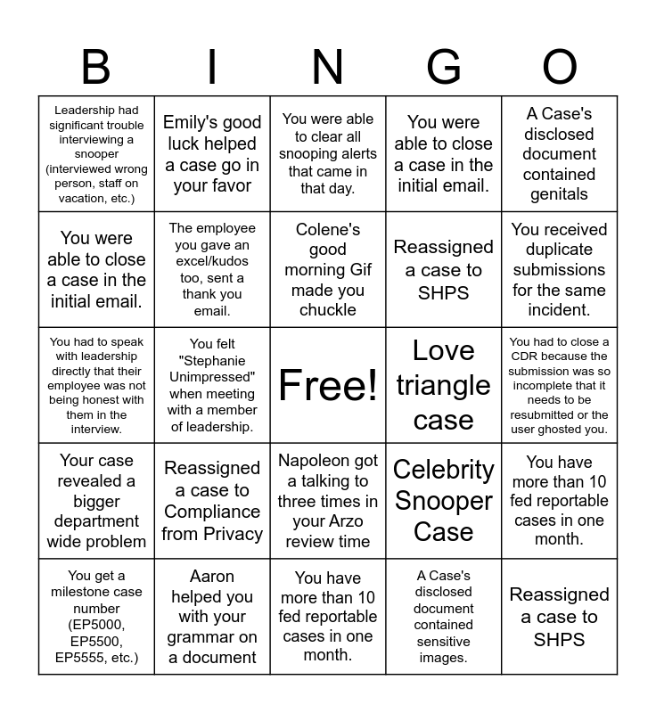 This bingo card has a free space and 68 words: Reassigned a case to Compliance from Privacy, Reassigned a case to SHPS, Celebrity Snooper Case, Your case revealed a bigger department wide problem, Love triangle case, Aaron helped you with your grammar on a document, Emily's good luck helped a case go in your favor, Your case question got a TJ - ism. (wah wah, nothing burger, etc), Colene's good morning Gif made you chuckle, You have more than 10 fed reportable cases in one month., Napoleon got a talking to three times in your Arzo review time, You were able to clear all snooping alerts that came in that day., You had to close a CDR because the submission was so incomplete that it needs to be resubmitted or the user ghosted you., A Case's disclosed document contained genitals, In a two week span you received three cases with the same error (face sheets, hover bubble, twins etc.), You were able to close a case in the initial email., You felt "Stephanie Unimpressed" when meeting with a member of leadership., Leadership had significant trouble interviewing a snooper (interviewed wrong person, staff on vacation, etc.), You get a milestone case number (EP5000, EP5500, EP5555, etc.), Reassigned a case to Compliance from Privacy, Reassigned a case to SHPS, Celebrity Snooper Case, Your case revealed a bigger department wide problem, Love triangle case, Aaron helped you with your grammar on a document, Emily's good luck helped a case go in your favor, Your case question got a TJ - ism. (wah wah, nothing burger, etc), Colene's good morning Gif made you chuckle, You have more than 10 fed reportable cases in one month., Napoleon got a talking to three times in your Arzo review time, You were able to clear all snooping alerts that came in that day., You had to close a CDR because the submission was so incomplete that it needs to be resubmitted or the user ghosted you., A Case's disclosed document contained genitals, In a two week span you received three cases with the same error (face sheets, hover bubble, twins etc.), You were able to close a case in the initial email., You felt "Stephanie Unimpressed" when meeting with a member of leadership., Leadership had significant trouble interviewing a snooper (interviewed wrong person, staff on vacation, etc.), You get a milestone case number (EP5000, EP5500, EP5555, etc.), You received duplicate submissions for the same incident., You had to speak with leadership directly that their employee was not being honest with them in the interview., You chose the treat for the in office day., Leadership responded to your initial snooping alert and case opening email in the same day., The employee you gave an excel/kudos too, sent a thank you email., You learned something new from a Webinar., Reassigned a case to Compliance from Privacy, Reassigned a case to SHPS, Celebrity Snooper Case, Your case revealed a bigger department wide problem, Love triangle case, Aaron helped you with your grammar on a document, Emily's good luck helped a case go in your favor, Your case question got a TJ - ism. (wah wah, nothing burger, etc), Colene's good morning Gif made you chuckle, You have more than 10 fed reportable cases in one month., Napoleon got a talking to three times in your Arzo review time, You were able to clear all snooping alerts that came in that day., A Case's disclosed document contained sensitive images., In a two week span you received three cases with the same error (face sheets, hover bubble, twins etc.), You were able to close a case in the initial email., You felt "Stephanie Unimpressed" when meeting with a member of leadership., Leadership had significant trouble interviewing a snooper (interviewed wrong person, staff on vacation, etc.), You get a milestone case number (EP5000, EP5500, EP5555, etc.), You received duplicate submissions for the same incident., You had to speak with leadership directly that their employee was not being honest with them in the interview., You chose the treat for the in office day., Leadership responded to your initial snooping alert and case opening email in the same day., The employee you gave an excel/kudos too, sent a thank you email. and You learned something new from a Webinar..