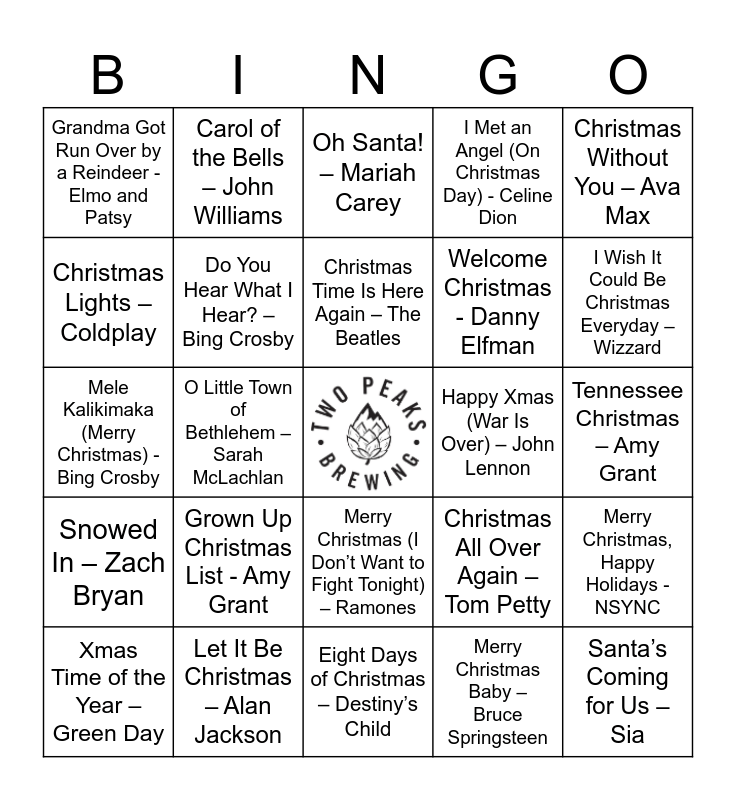 This bingo card has a free space and 65 words: A Christmas to Remember β Dolly Parton & Kenny Rogers, A Holly Jolly Christmas β Burl Ives, A Marshmallow World - Darlene Love, All I Want for Christmas Is You β Mariah Carey, Angels We Have Heard on High β Josh Groban, Baby, Its Cold Outside - Idina Menzel ft Michael Buble, Carol of the Bells β John Williams, Christmas (Baby Please Come Home) β Mariah Carey, Christmas All Over Again β Tom Petty, Christmas Cookies β George Strait, Christmas Lights β Coldplay, Christmas Time (Donβt Let the Bells End) β The Darkness, Christmas Tree Farm β Taylor Swift, Christmas Without You β Ava Max, Do They Know It's Christmas? - Band Aid, Do You Hear What I Hear? β Bing Crosby, Christmas Time Is Here Again β The Beatles, I Met an Angel (On Christmas Day) - Celine Dion, Fairytale of New York β The Pogues feat. Kirsty MacColl, Grandma Got Run Over by a Reindeer - Elmo and Patsy, Grown Up Christmas List - Amy Grant, Eight Days of Christmas β Destinyβs Child, Happy Xmas (War Is Over) β John Lennon, Hard Candy Christmas β Dolly Parton, Holidays β Meghan Trainor & Earth, Wind & Fire, Hot Chocolate β Tom Hanks, Happy Holiday β Andy Williams, I Want a Hippopotamus for Christmas β Gayla Peevey, I Wish It Could Be Christmas Everyday β Wizzard, Last Christmas β Wham!, Let It Be Christmas β Alan Jackson, I Saw Mommy Kissing Santa Claus, Like Itβs Christmas β Jonas Brothers, Boney M - Mary's Boy Child, Mele Kalikimaka (Merry Christmas) - Bing Crosby, Merry Christmas - Ed Sheeran, Elton John, Let It Snow! Let It Snow! Let It Snow! β Dean Martin, Merry Christmas Baby β Bruce Springsteen, Merry Christmas, Happy Holidays - NSYNC, O Holy Night β Mariah Carey, O Little Town of Bethlehem β Sarah McLachlan, Merry Christmas (I Donβt Want to Fight Tonight) β Ramones, One More Sleep β Leona Lewis, Peace on Earth/Little Drummer Boy β Bing Crosby & David Bowie, Santa Baby β Eartha Kitt, Santa Claus Is Coming to Town β Jackson 5, Oh Santa! β Mariah Carey, Santa, Can't You Hear Me - Kelly Clarkson, Ariana Grande, Santaβs Coming for Us β Sia, Snowed In β Zach Bryan, Snowman β Sia, Santa Tell Me β Ariana Grande, Step Into Christmas β Elton John, Tennessee Christmas β Amy Grant, This Christmas β Donny Hathaway, Underneath the Tree β Kelly Clarkson, Someday at Christmas β Stevie Wonder, Welcome Christmas - Danny Elfman, What Christmas Means to Me β Stevie Wonder, Xmas Time of the Year β Green Day, You Donβt Have to be Alone (On Christmas) - NSYNC, We Wish You a Merry Christmas β The Weavers, You're a Mean One, Mr Grinch - Thurl Ravenscott, Silent Night β Bing Crosby and You Make It Feel Like Christmas β Gwen Stefani.