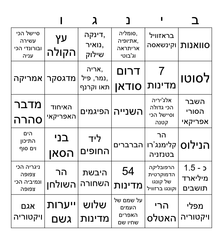 אפריקה | בינגו שירים | מערכות יחסים | בינגו יום ירושלים | יום ירושלים