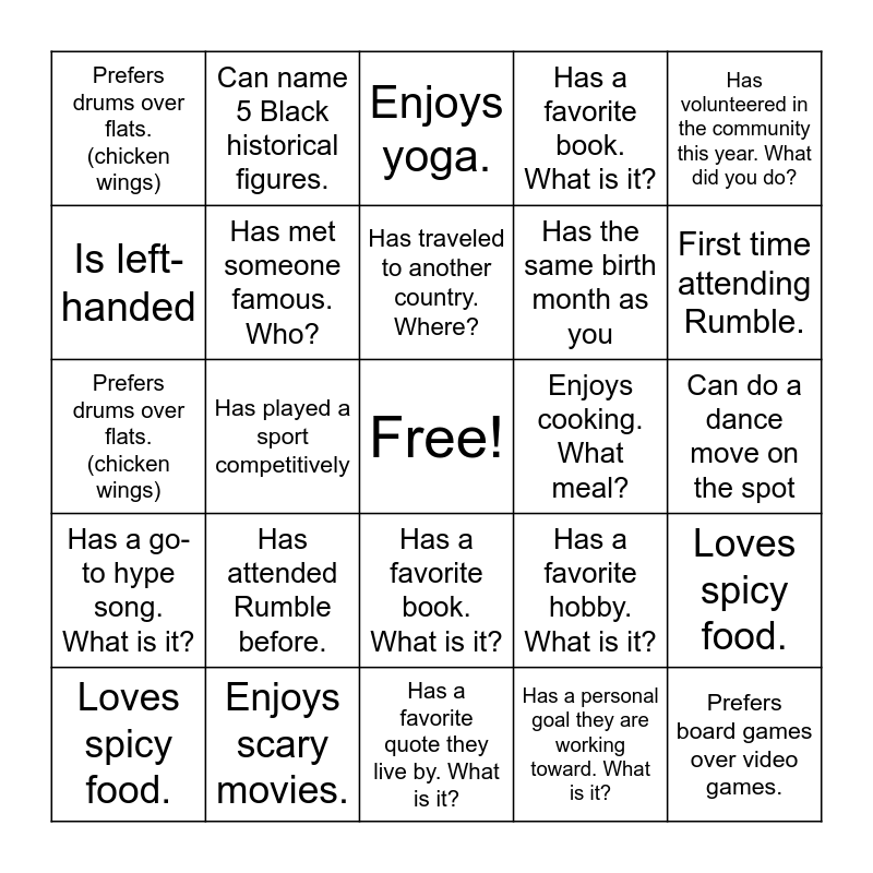 This bingo card has a free space and 63 words: Has attended Rumble before., Is the oldest child., First time attending Rumble., Loves spicy food., Has a mentor they are grateful for. Who are they?, Has a go-to hype song. What is it?, Can name 5 Black historical figures., Has a personal goal they are working toward. What is it?, Has traveled to another country. Where?, Has met someone famous. Who?, Has a favorite book. What is it?, Has lived in more than one state, Where?, Can do a dance move on the spot, Has volunteered in the community this year. What did you do?, Can recite a line from a poem, rap, or movie, Is left-handed, Has played a sport competitively, Prefers drums over flats. (chicken wings), Has a name with more than 8 letters, Has the same birth month as you, Has attended Rumble before., Has a go-to hype song. What is it?, Has a favorite book. What is it?, Can recite a line from a poem, rap, or movie, Has the same birth month as you, Is left-handed, Is the oldest child., Has traveled to another country. Where?, Can play an instrument? Which one?, Has lived in more than one state, Where?, Can do a dance move on the spot, Has volunteered in the community this year. What did you do?, Can name 5 Black historical figures., Has performed on stage (music, dance, poetry, etc.), First time attending Rumble., Loves spicy food., Has a mentor they are grateful for. Who are they?, Has a personal goal they are working toward. What is it?, Has played a sport competitively, Has met someone famous. Who?, Prefers drums over flats. (chicken wings), Enjoys cooking. What meal?, Has a name with more than 8 letters, Owns a business. What is it?, Prefers board games over video games., Enjoys scary movies., Exercises weekly., Has a favorite hobby. What is it?, Has never broken a bone, Has won an award or recognition for their work, Has completed a challenging physical feat, like a marathon or a triathlon, Has a favorite quote they live by. What is it?, Has a hidden talent they're willing to share, Has a pet cat. Show a picture., Wears glasses or contacts., Enjoys yoga., Has a food allergy., Has been to the beach., Prefers coffee over tea., Has performed on stage (music, dance, poetry, etc.), Can play an instrument? Which one?, Enjoys cooking. What meal? and Owns a business. What is it?.