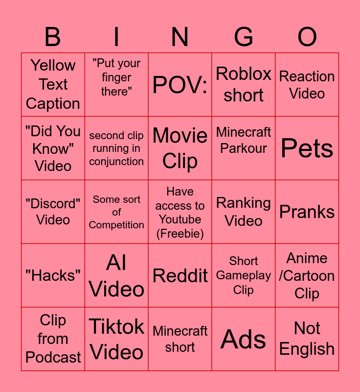 This bingo card has a free space and 24 words: AI Video, Tiktok Video, Movie Clip, Clip from Podcast, Reaction Video, Yellow Text Caption, "Did You Know" Video, "Put your finger there", Ranking Video, Reddit, Minecraft Parkour, "Discord" Video, Short Gameplay Clip, Anime /Cartoon Clip, second clip running in conjunction, Ads, Pranks, POV:, Pets, Some sort of Competition, Not English, "Hacks", Roblox short and Minecraft short.