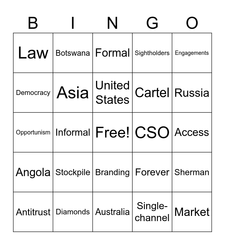 This bingo card has a free space and 24 words: Stockpile, Diamonds, United States, Antitrust, Engagements, Law, Democracy, Botswana, CSO, Branding, Cartel, Opportunism, Forever, Sherman, Asia, Single-channel, Access, Formal, Russia, Informal, Market, Angola, Sightholders and Australia.