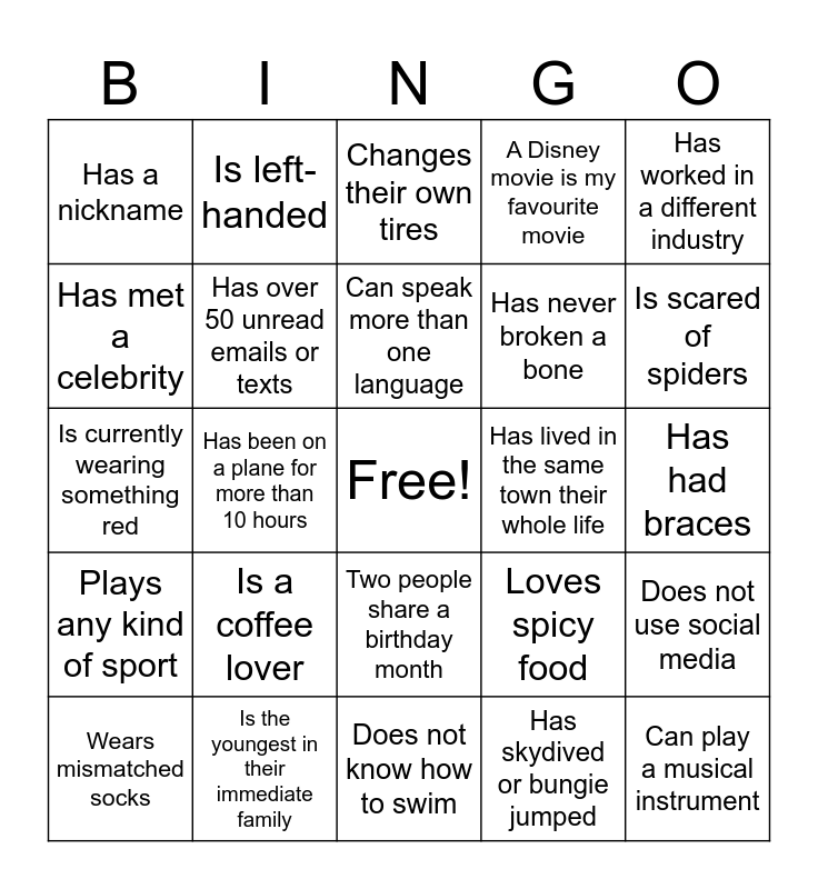 This bingo card has a free space and 24 words: Is a coffee lover, Is the youngest in their immediate family, Can speak more than one language, Wears mismatched socks, Has worked in a different industry, Has a nickname, Has met a celebrity, Is left-handed, Has lived in the same town their whole life, Two people share a birthday month, Has never broken a bone, Is currently wearing something red, Loves spicy food, Does not use social media, Has over 50 unread emails or texts, Has skydived or bungie jumped, Has had braces, Changes their own tires, Is scared of spiders, Has been on a plane for more than 10 hours, Can play a musical instrument, Plays any kind of sport, A Disney movie is my favourite movie and Does not know how to swim.