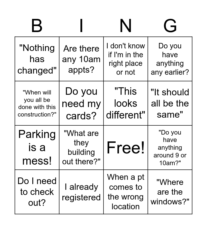 This bingo card has 16 words: I already registered, "Do you have anything around 9 or 10am?", I don't know if I'm in the right place or not, "Nothing has changed", Parking is a mess!, Are there any 10am appts?, Free!, When a pt comes to the wrong location, "When will you all be done with this construction?", Do you need my cards?, Do I need to check out?, Do you have anything any earlier?, "What are they building out there?", "It should all be the same", "This looks different" and "Where are the windows?".