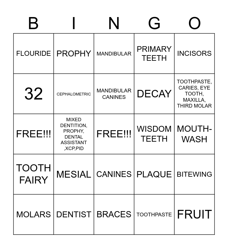 This bingo card has a free space and 54 words: VEGGIES, TOOTH FAIRY, CAVITY, 20, CANINES, TOOTH, PRIMARY TEETH, GUMS, 32, TOOTH- PASTE, FLOURIDE, CHECKUP, DENTIST, MOLARS, HEALTHY, BRACES, FRUIT, DECAY, FLOSS, MOUTH- WASH, PLAQUE, TOOTH- BRUSH, WISDOM TEETH, INCISORS, MIXED DENTITION, PROPHY, DENTAL ASSISTANT, XCP, PID, TOOTHPASTE, CARIES, EYE TOOTH, MAXILLA, THIRD MOLAR, MANDIBULAR, PA, FREE!!!, BITEWING, PANO, CEPHALOMETRIC, COMPOSITE, ECTHING, BONDING, OCCLUSAL X-RAY, MESIAL, DISTAL, DISTAL, MAXILLARY LATERAL TOOTH, MANDIBULAR CANINES, MIXED DENTITION, PROPHY, DENTAL ASSISTANT ,XCP,PID, TOOTHPASTE, CARIES, EYE TOOTH, MAXILLA, THIRD MOLAR, MANDIBULAR, PA, FREE!!! BITEWING, PANO, CEPHALOMETRIC, COMPOSITE, ECTHING, BONDING, OCCLUSAL X-RAY and MESIAL, DISTAL, DISTAL, MAXILLARY LATERAL TOOTH, MANDIBULAR CANINES.