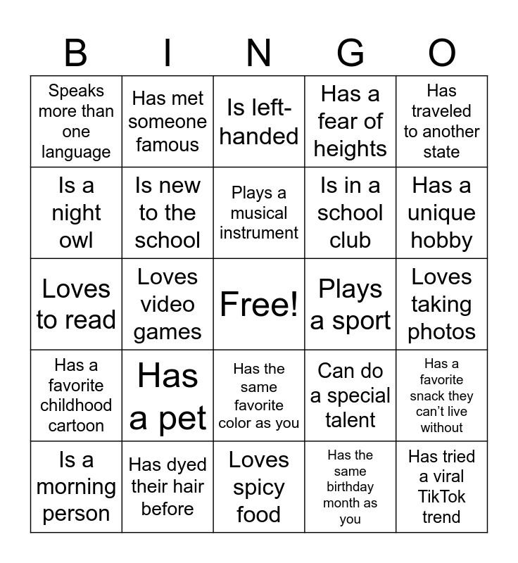This bingo card has a free space and 24 words: Has a pet, Has dyed their hair before, Plays a musical instrument, Is a morning person, Has traveled to another state, Speaks more than one language, Is a night owl, Has met someone famous, Plays a sport, Has the same favorite color as you, Is in a school club, Loves to read, Can do a special talent, Has a favorite snack they can’t live without, Is new to the school, Has the same birthday month as you, Loves taking photos, Is left-handed, Has a unique hobby, Loves video games, Has tried a viral TikTok trend, Has a favorite childhood cartoon, Has a fear of heights and Loves spicy food.