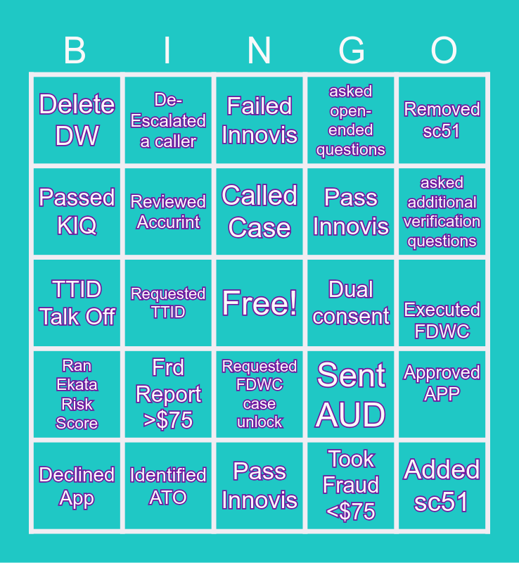 This bingo card has a free space and 24 words: Declined App, Frd Report >$75, Called Case, Took Fraud <$75, Removed sc51, Delete DW, De-Escalated a caller, Failed Innovis, Dual consent, Executed FDWC, TTID Talk Off, Reviewed Accurint, Sent AUD, Approved APP, Passed KIQ, Identified ATO, Pass Innovis, asked open-ended questions, asked additional verification questions, Ran Ekata Risk Score, Requested TTID, Requested FDWC case unlock, Pass Innovis and Added sc51.