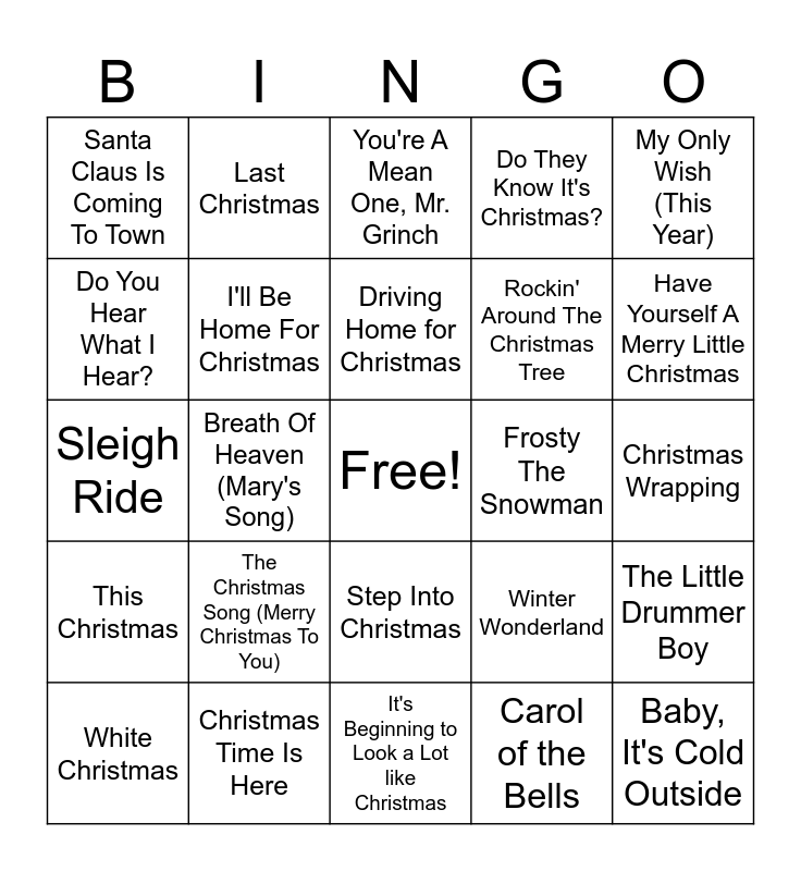 This bingo card has a free space and 71 words: All I Want for Christmas Is You, Last Christmas, Jingle Bell Rock, Santa Tell Me, It's Beginning to Look a Lot like Christmas, Christmas (Baby Please Come Home), Do They Know It's Christmas?, Let It Snow! Let It Snow! Let It Snow!, Rockin' Around The Christmas Tree, Feliz Navidad, White Christmas, Underneath the Tree, Have Yourself A Merry Little Christmas, Santa Claus Is Coming To Town, Mistletoe, Sleigh Ride, Winter Wonderland, My Only Wish (This Year), Days of Christmas, Christmas Wrapping, The Christmas Song (Merry Christmas To You), Baby, It's Cold Outside, The Little Drummer Boy, Wonderful Christmastime, Blue Christmas, Happy Xmas (War Is Over), A Holly Jolly Christmas, Merry Christmas Everyone, Please Come Home for Christmas, I Saw Mommy Kissing Santa Claus, Christmas Time Is Here, Run Rudolph Run, Mele Kalikimaka, The First Noel, Carol of the Bells, I Wish It Could Be Christmas Everyday, Silver Bells, Merry Christmas, Happy Holidays, Do You Hear What I Hear?, O Holy Night, Step Into Christmas, Christmas Lights, This Christmas, Little Saint Nick, Rudolph The Red-Nosed Reindeer, One More Sleep, Hard Candy Christmas, I'll Be Home For Christmas, Deck The Hall, Joy to the World, Merry Christmas Baby, I Heard the Bells on Christmas Day, Frosty The Snowman, O Come All Ye Faithful, What Christmas Means To Me, Snowman, Driving Home for Christmas, Someday At Christmas, It's the Most Wonderful Time of the Year, Grown-Up Christmas List, Silent Night, Ave Maria, Breath Of Heaven (Mary's Song), Happy Holiday / The Holiday Season, Jingle Bells, Christmas In Hollis, You're A Mean One, Mr. Grinch, Hallelujah, Merry Christmas - Elton John, Hometown Christmas and God Rest Ye Merry Gentlemen.