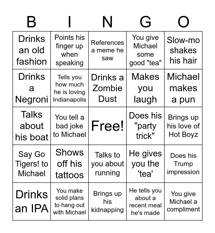This bingo card has a free space and 25 words: Shows off his tattoos, Brings up his kidnapping, Drinks a Zombie Dust, Drinks an IPA, Slow-mo shakes his hair, Drinks an old fashion, Drinks a Negroni, Points his finger up when speaking, Does his "party trick", Talks to you about running, Makes you laugh, Talks about his boat, He gives you the 'tea', Does his Trump impression, Tells you how much he is loving Indianapolis, Gets called the Tariff Sheriff by someone else, Brings up his love of Hot Boyz, References a meme he saw, Michael makes a pun, You tell a bad joke to Michael, You give Michael a compliment, You make solid plans to hang out with Michael, Say Go Tigers! to Michael, You give Michael some good "tea" and He tells you about a recent meal he's made.