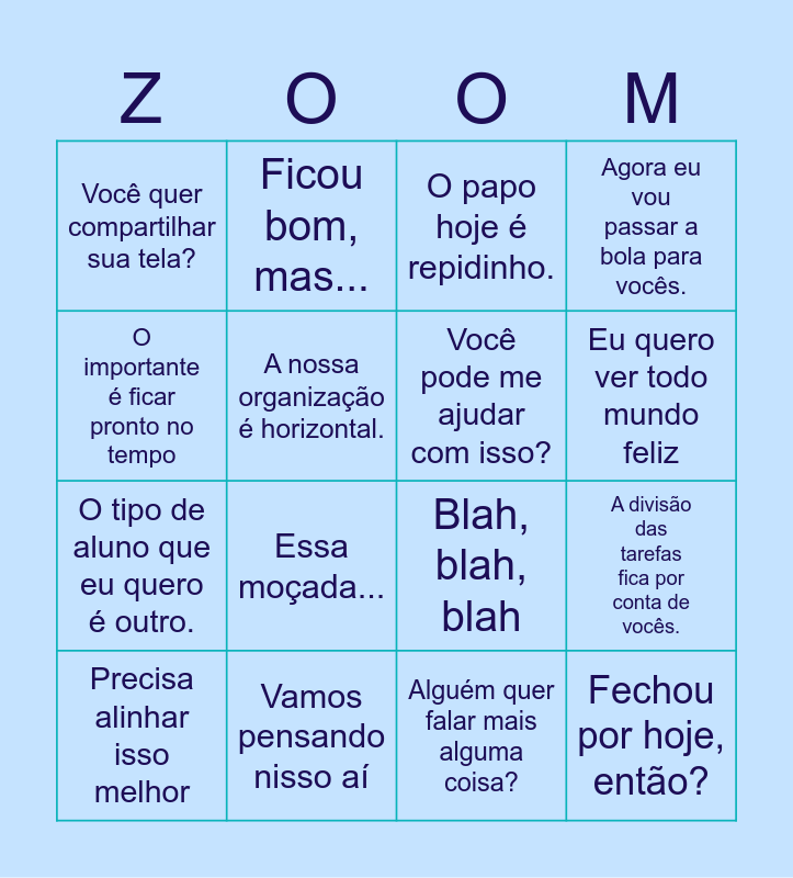 This bingo card has 16 words: Precisa alinhar isso melhor, Vamos pensando nisso aí, O papo hoje é repidinho., Agora eu vou passar a bola para vocês., O importante é ficar pronto no tempo, Ficou bom, mas..., Blah, blah, blah, A divisão das tarefas fica por conta de vocês., Você quer compartilhar sua tela?, A nossa organização é horizontal., Alguém quer falar mais alguma coisa?, Eu quero ver todo mundo feliz, O tipo de aluno que eu quero é outro., Essa moçada..., Você pode me ajudar com isso? and Fechou por hoje, então?.