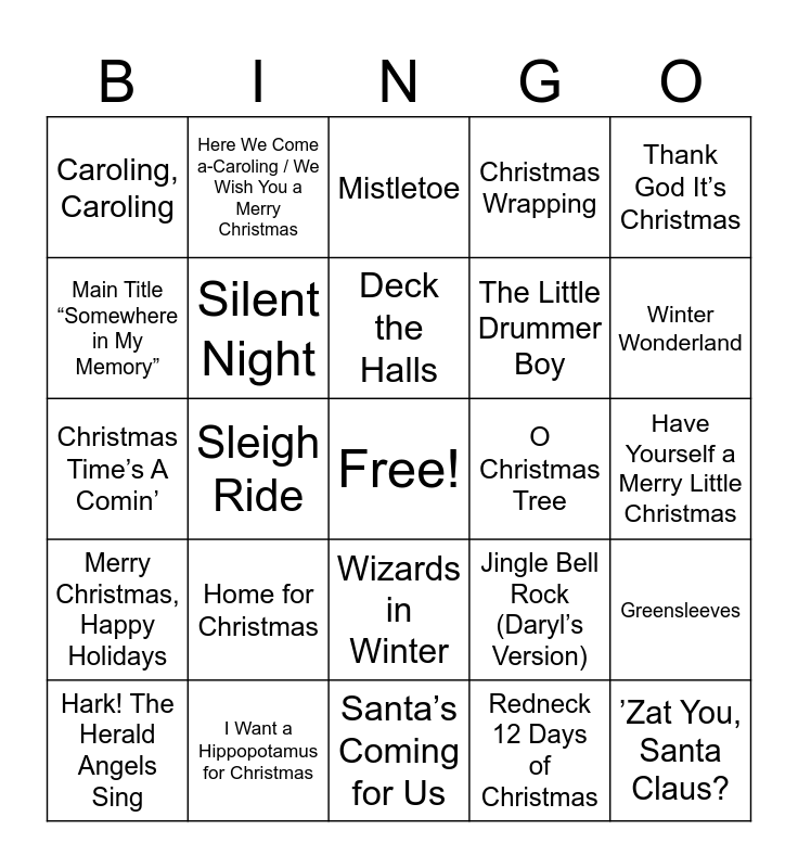 This bingo card has a free space and 39 words: Christmas Canon, There’s Always Santa Magic by the Fireplace, Do You Hear What I Hear?, Silent Night, Hark! The Herald Angels Sing, Wizards in Winter, Deck the Halls, Joy to the World, Thank God It’s Christmas, Merry Christmas, Happy Holidays, Sleigh Ride, Christmas Wrapping, ’Zat You, Santa Claus?, Have Yourself a Merry Little Christmas, O Christmas Tree, Home for Christmas, Cool Yule, Caroling, Caroling, Here Comes Santa Claus (Right Down Santa Claus Lane), Jingle Bell Rock (Daryl’s Version), Main Title “Somewhere in My Memory”, Santa’s Coming for Us, The Little Drummer Boy, Winter Wonderland, Santa Claus Is Back in Town, O Christmas Tree (feat. Count Basie Big Band), Hot Chocolate, Father Christmas, Santa Tell Me, Here We Come a-Caroling / We Wish You a Merry Christmas, Twelve Days of Christmas, If Every Day Was Like Christmas, Mistletoe, I Want a Hippopotamus for Christmas, Redneck 12 Days of Christmas, Christmas Carols by the Old Corral, Greensleeves, Christmas Time’s A Comin’ and The Very Best Day This Year.