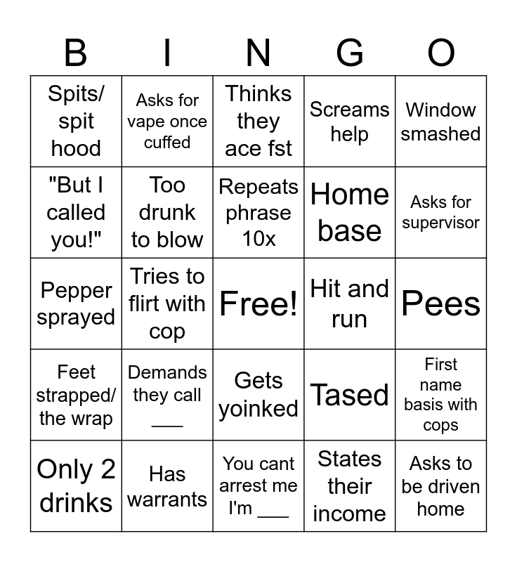 This bingo card has a free space and 29 words: Only 2 drinks, Not driving, traveling, Tries to flirt with cop, Kicks in car, Spits/ spit hood, Thinks they ace fst, Too drunk to blow, Demands they call ___, Hit and run, Has warrants, Pees, Asks to be driven home, You cant arrest me I'm ___, States their income, Asks for supervisor, Has chance to just leave, Gets yoinked, Feet strapped/ the wrap, Window smashed, Pepper sprayed, Tased, Racist, Home base, "But I called you!", Screams help, Asks for vape once cuffed, First name basis with cops, Repeats phrase 10x and Refuse to ID.