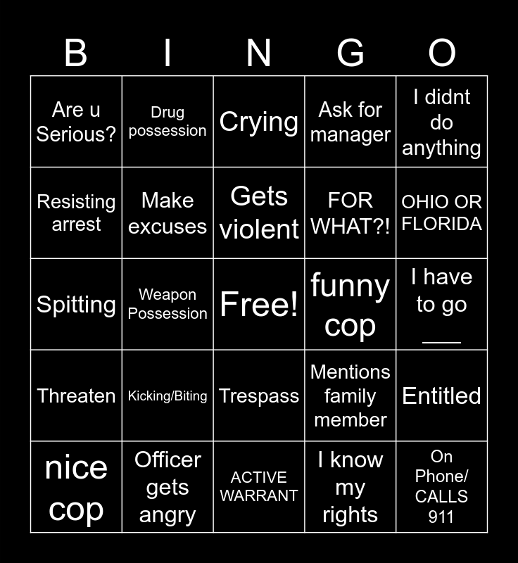 This bingo card has a free space and 40 words: Scream, Weapon Possession, don't touch me, funny cop, Mention lawyer, nice cop, Make excuses, CURSING, FOR WHAT?!, Entitled, Spitting, Drug possession, I know my rights, I have to go ___, Threaten, Kicking/Biting, No license or insurance, Ask for manager, Feet cuffed/ binded, Are u Serious?, Officer gets angry, Gets violent, Mentions family member, OHIO OR FLORIDA, DRUNK/ DUI, Taser/pepper spray, ACTIVE WARRANT, Do you know who I am, Running from cops, Insult remarks, Handcuffs, Crying, Racist remarks, On Phone/ CALLS 911, Resisting arrest, THREATEN TO SUE, Trespass, Refuse to comply, I didnt do anything and Begging.
