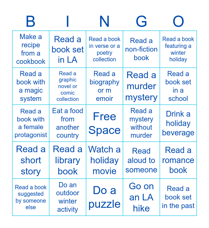 This bingo card has a free space and 24 words: Read a library book, Do an outdoor winter activity, Read a biography or memoir, Read a book suggested by someone else, Read a book featuring a winter holiday, Make a recipe from a cookbook, Read a book with a magic system, Read a book set in LA, Read a mystery without murder, Watch a holiday movie, Read a murder mystery, Read a book with a female protagonist, Read aloud to someone, Read a romance book, Read a graphic novel or comic collection, Go on an LA hike, Drink a holiday beverage, Read a book in verse or a poetry collection, Read a book set in a school, Eat a food from another country, Read a book set in the past, Read a short story, Read a non-fiction book and Do a puzzle.
