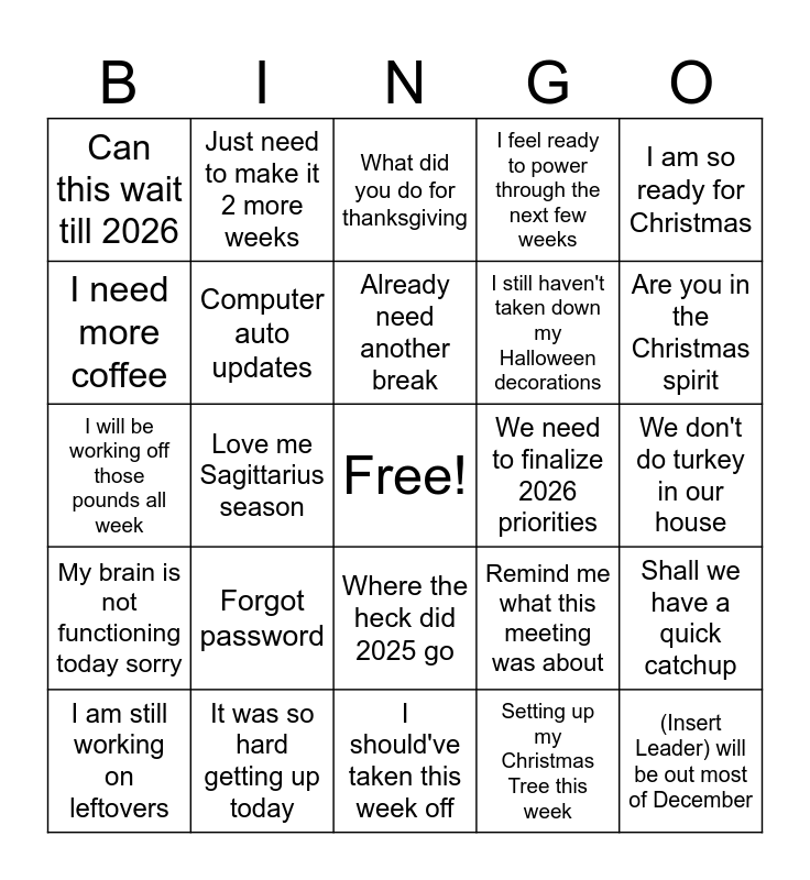 This bingo card has a free space and 24 words: I am still working on leftovers, Forgot password, Already need another break, Setting up my Christmas Tree this week, I am so ready for Christmas, Can this wait till 2026, Just need to make it 2 more weeks, What did you do for thanksgiving, We need to finalize 2026 priorities, We don't do turkey in our house, I will be working off those pounds all week, Computer auto updates, Remind me what this meeting was about, Shall we have a quick catchup, I need more coffee, It was so hard getting up today, I should've taken this week off, I feel ready to power through the next few weeks, Are you in the Christmas spirit, My brain is not functioning today sorry, Love me Sagittarius season, Where the heck did 2025 go, I still haven't taken down my Halloween decorations and (Insert Leader) will be out most of December.
