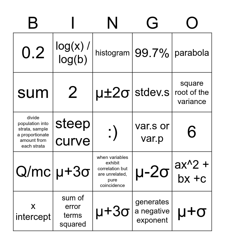 This bingo card has a free space and 34 words: lowest number of decimal places, generates a negative exponent, m, n, Q/mc, 2, parabola, x intercept, log(x) / log(b), 1/4(10)^x, μ±2σ, histogram, line graph, correl, var.s or var.p, square root of the variance, sum of error terms squared, divide population into strata, sample a proportionate amount from each strata, μ+3σ, μ-2σ, when variables exhibit correlation but are unrelated, pure coincidence, center, 0.2, 6, μ+3σ, μ+σ, 99.7%, divide population into clusters, sample an entire cluster, stdev.s, sum, y intercept, steep curve, ax^2 + bx +c and units you have = units you want/units you have.