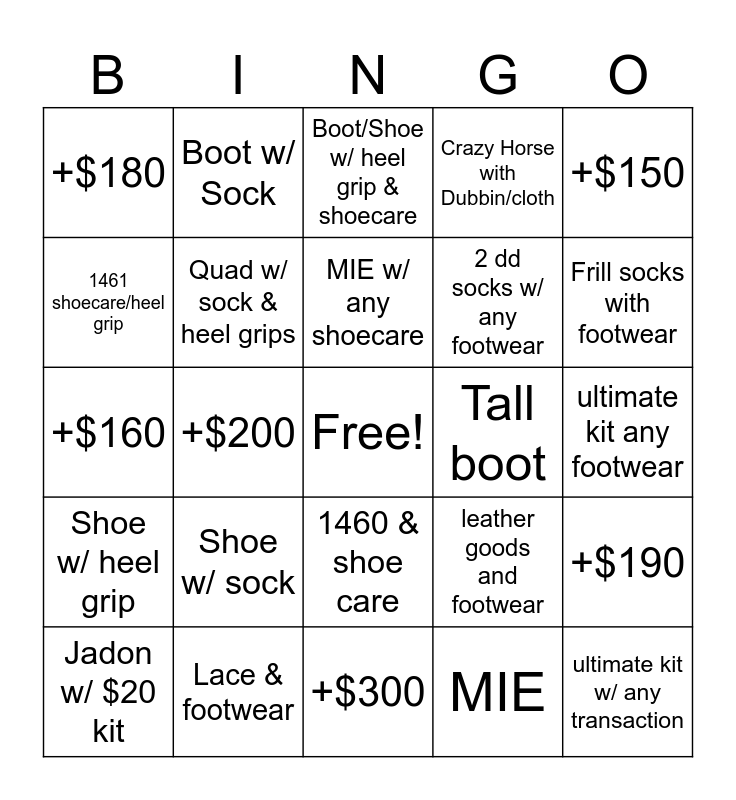 This bingo card has a free space and 24 words: Shoe w/ sock, Lace & footwear, MIE w/ any shoecare, Jadon w/ $20 kit, +$150, +$180, 1461 shoecare/heel grip, Boot w/ Sock, Tall boot, 1460 & shoe care, 2 dd socks w/ any footwear, +$160, leather goods and footwear, +$190, Quad w/ sock & heel grips, MIE, ultimate kit any footwear, Boot/Shoe w/ heel grip & shoecare, Frill socks with footwear, +$200, ultimate kit w/ any transaction, Shoe w/ heel grip, Crazy Horse with Dubbin/cloth and +$300.