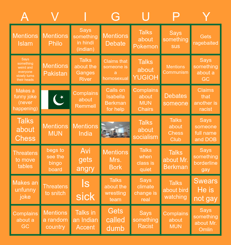 This bingo card has 2 images, a free space and 48 words: Swears He is not gay, Mentions Communism, Complains about MUN, Mentions MUN, Complains about Remmell, Mentions Mrs. Bork, Mentions Philo, Gets called dumb, Says something sus, Talks when class is quiet, Gets ragebaited, Mentions Debate, Debates someone, Complains about MUN Chairs, Is sick, Says someone full name and DOB, Says something weird and everyone slowly turns their heads, Says something about a GC, Complains about a GC, Talks about Pokemon, Talks about YUGIOH, Mentions India, Mentions Islam, Mentions Pakistan, Mentions a random country, Says something about Mr. Omlin, Talks about the Ganges River, Talks in an Indian Accent, Says something in hindi (indian), Calls on Isabella Berkman for help, Says he hates this table, Threatens to move tables, Threatens to snitch, Talks about the wrestling team, Talks about Chess, Talks about Chess Club, Talks about Mr. Berkman, Says something borderline gay, Makes an unfunny joke, Makes a funny joke (never happening), Avi gets angry, Says climate change is real, begs to see the bingo board, Says something Racist, Claims that another is racist, Claims that someone is a homosexual, Talks about socialism and Talks about bird watching.