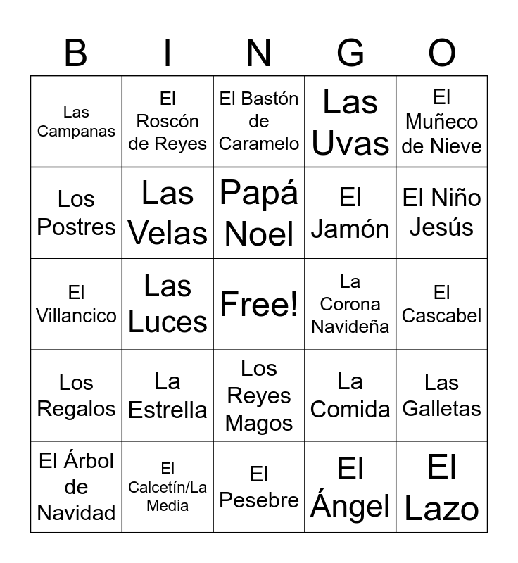 This bingo card has a free space and 29 words: El Árbol de Navidad, La Guirnalda, Las Luces, Los Adornos, Las Campanas, El Bastón de Caramelo, Las Velas, La Estrella, La Corona Navideña, El Calcetín/La Media, El Cascabel, El Lazo, El Pesebre, El Ángel, El Niño Jesús, María y José, Los Reyes Magos, Los Regalos, El Muñeco de Nieve, El Villancico, La Comida, El Pavo, El Jamón, Los Postres, Las Uvas, El Roscón de Reyes, Las Galletas, Papá Noel and Los Renos.