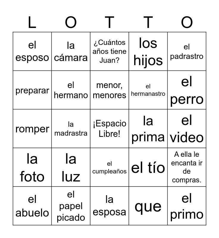 This bingo card has a free space and 56 words: los abuelos, el abuelo, la abuela, el esposo, la esposa, los hermanos, el hermano, la hermana, el hermanastro, la hermanastra, los hijos, el hijo, la hija, los padres, el padre, la madre, el padrastro, la madrastra, los primos, el primo, la prima, los tíos, el tío, ¿Cuántos años tiene Juan?, mayor, mayores, menor, menores, la persona, el gato, el perro, abrir, celebrar, decorar, las decoraciones, hacer un video, el video, preparar, romper, sacar fotos, la foto, la cámara, el cumpleaños, ¡Feliz cumpleaños!, los dulces, la flor, el globo, la luz, el papel picado, el pastel, la piñata, el regalo, que, sólo, tener, A él le gusta ir de pesca., A ella le encanta ir de compras. and Raquel tiene quince años..