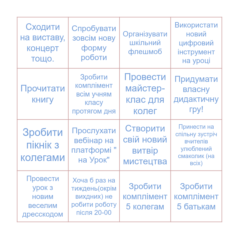 This bingo card has 17 words: Зробити комплімент 5 колегам, Провести урок з новим веселим дресскодом, Організувати шкільний флешмоб, Сходити на виставу, концерт тощо., Прослухати вебінар на платформі " на Урок", Використати новий цифровий інструмент на уроці, Принести на спільну зустріч вчителів улюблений смаколик (на всіх), Провести майстер-клас для колег, Придумати власну дидактичну гру!, Зробити комплімент всім учням класу протягом дня, Хоча б раз на тиждень(окрім вихдних) не робити роботу після 20-00, Створити свій новий витвір мистецтва, Прочитати книгу, Спробувати зовсім нову форму роботи, Зробити пікнік з колегами, Провести урок разом з колегою and Зробити комплімент 5 батькам.