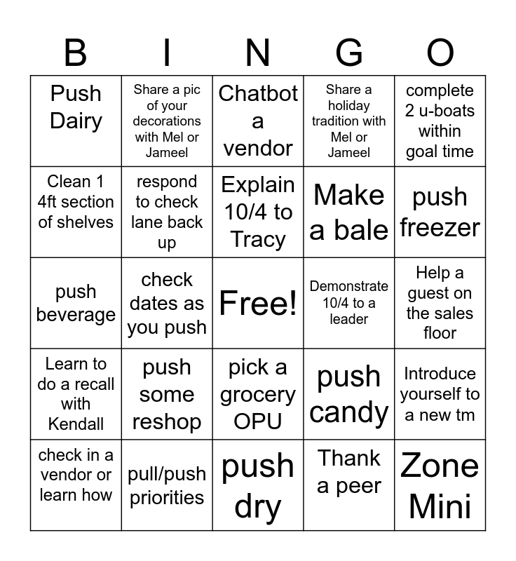 This bingo card has a free space and 29 words: check in a vendor or learn how, Make a guest smile, check dates as you push, complete a workday training, Push Dairy, Chatbot a vendor, respond to check lane back up, push some reshop, Demonstrate 10/4 to a leader, pull/push priorities, Help a guest on the sales floor, Zone Mini, push dry, Thank a peer, push freezer, Find 10 out dated items (and process), pick a grocery OPU, Learn to do a recall with Kendall, complete 2 u-boats within goal time, push beverage, push candy, clean up a spill, Make a bale, Clean 1 4ft section of shelves, Share a holiday tradition with Mel or Jameel, Share a pic of your decorations with Mel or Jameel, Introduce yourself to a new tm, Explain 10/4 to Tracy and Complete everything on your assignment sheet.