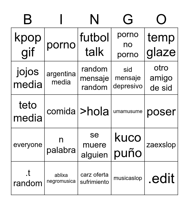 This bingo card has a free space and 24 words: n palabra, ablixa negromusica, random mensaje random, .t random, temp glaze, kpop gif, jojos media, porno, umamusume, se muere alguien, sid mensaje depresivo, teto media, kuco puño, zaexslop, argentina media, musicaslop, poser, futbol talk, otro amigo de sid, comida, .edit, everyone, porno no porno and carz oferta sufrimiento.