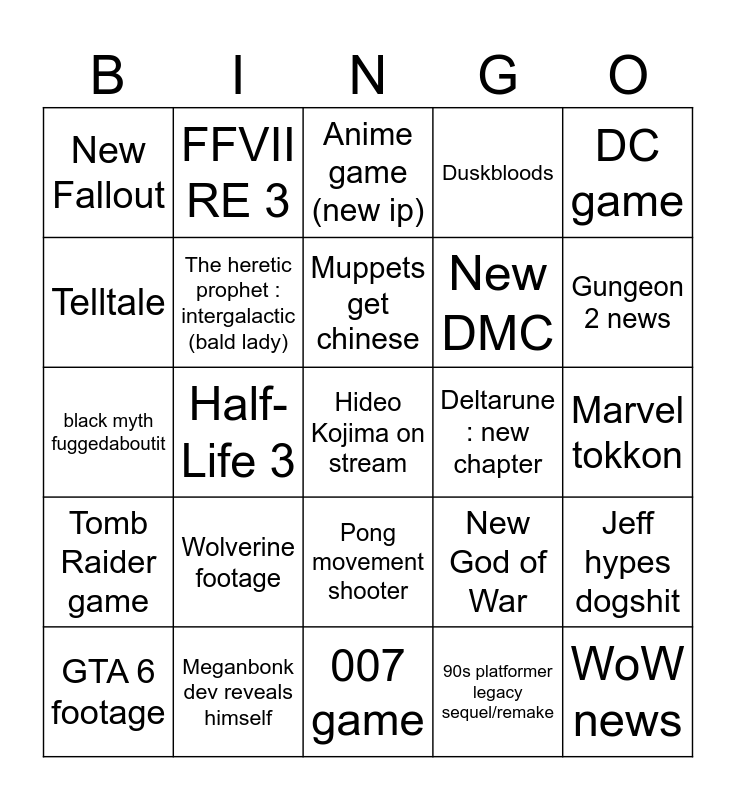 This bingo card has a free space and 29 words: GTA 6 footage, RE9, Half-Life 3, The Elder Scrolls 6, New Fallout, Anime game (new ip), The heretic prophet : intergalactic (bald lady), Wolverine footage, Deltarune : new chapter, Meganbonk dev reveals himself, Marvel tokkon, WoW news, 007 game, 90s platformer legacy sequel/remake, Gungeon 2 news, Halo remake news, Pong movement shooter, Tomb Raider game, DC game, black myth fuggedaboutit, New God of War, Persona Green, New DMC, Telltale, Duskbloods, FFVII RE 3, Jeff hypes dogshit, Muppets get chinese and Horizon Zero Dawn (kill everyone).