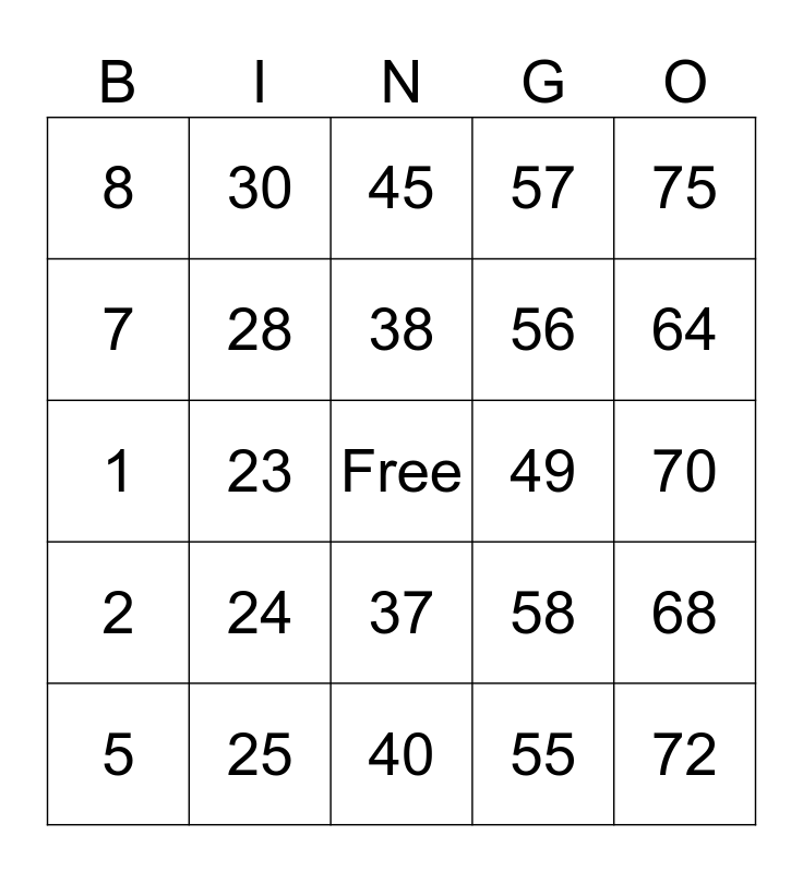 This bingo card has a free space and 24 words: 5, 24, 38, 55, 75, 8, 30, 45, 49, 70, 1, 28, 58, 68, 7, 25, 40, 57, 64, 2, 23, 37, 56 and 72.