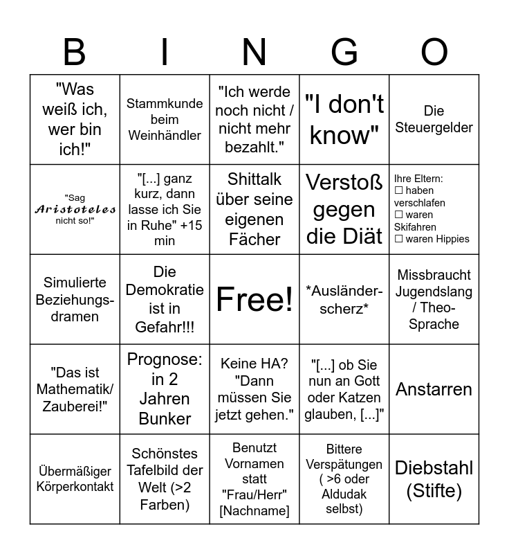 This bingo card has a free space and 30 words: Schönstes Tafelbild der Welt (>2 Farben), Frontet die Volt-Partei, Die Demokratie ist in Gefahr!!!, Lästert über Kollegen, "Was weiß ich, wer bin ich!", "Ich werde noch nicht / nicht mehr bezahlt.", "[...] ganz kurz, dann lasse ich Sie in Ruhe" +15 min, Keine HA? "Dann müssen Sie jetzt gehen.", *Ausländer-scherz*, Benutzt Vornamen statt "Frau/Herr" [Nachname], Missbraucht Jugendslang / Theo-Sprache, Diebstahl (Stifte), Bittere Verspätungen ( >6 oder Aldudak selbst), Wird in Zitatengruppe verewigt, Ihre Eltern: ☐ haben verschlafen ☐ waren Skifahren ☐ waren Hippies, Nennt Afd-Mitglieder, "[...] ob Sie nun an Gott oder Katzen glauben, [...]", "Das ist Mathematik/ Zauberei!", Prognose: in 2 Jahren Bunker, Die Steuergelder, Simulierte Beziehungs- dramen, "Das werde ich Ihnen beweisen!", Stammkunde beim Weinhändler, Verstoß gegen die Diät, "Sag 𝓐𝓻𝓲𝓼𝓽𝓸𝓽𝓮𝓵𝓮𝓼 nicht so!", "I don't know", Anstarren, Übermäßiger Körperkontakt, Shittalk über seine eigenen Fächer and "Er/Sie sagt das, nicht ich!".