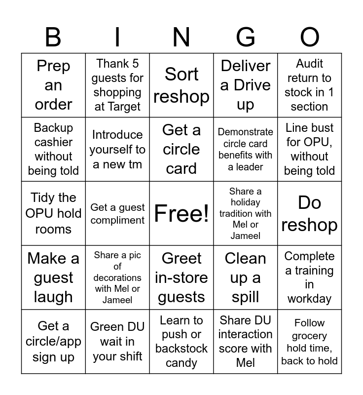 This bingo card has a free space and 26 words: Greet in-store guests, Share DU interaction score with Mel, Get a circle card, Green DU wait in your shift, Audit return to stock in 1 section, Prep an order, Backup cashier without being told, Thank 5 guests for shopping at Target, Do reshop, Clean up a spill, Demonstrate circle card benefits with a leader, Tidy the OPU hold rooms, Complete a training in workday, Get a circle/app sign up, Get a guest compliment, Wear a safety vest each DU shift, Deliver a Drive up, Make a guest laugh, Sort reshop, Follow grocery hold time, back to hold, Line bust for OPU, without being told, Learn to push or backstock candy, Share a holiday tradition with Mel or Jameel, Share a pic of decorations with Mel or Jameel, Introduce yourself to a new tm and Explain 10/4 to Tracy.