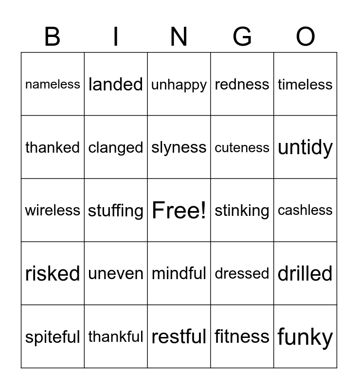 This bingo card has a free space and 24 words: uneven, thankful, slyness, spiteful, timeless, nameless, thanked, landed, stinking, mindful, cuteness, wireless, dressed, drilled, clanged, fitness, cashless, unhappy, untidy, stuffing, funky, risked, redness and restful.