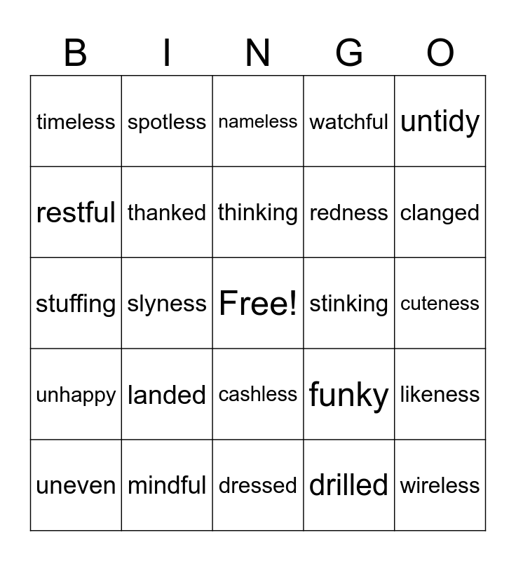 This bingo card has a free space and 29 words: uneven, thankful, slyness, spiteful, timeless, nameless, thanked, landed, stinking, mindful, cuteness, wireless, dressed, drilled, clanged, fitness, cashless, unhappy, untidy, stuffing, funky, risked, redness, restful, watchful, spotless, likeness, thinking and wishful.