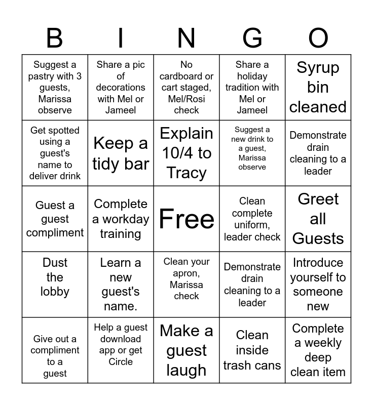 This bingo card has a free space and 29 words: Give out a compliment to a guest, Get spotted using a guest's name to deliver drink, Complete a workday training, Pastry case full open- 1 hr before close, Suggest a pastry with 3 guests, Marissa observe, No cardboard or cart staged, Mel/Rosi check, Keep a tidy bar, Learn a new guest's name., Clean complete uniform, leader check, Help a guest download app or get Circle, Greet all Guests, Complete a weekly deep clean item, Make a guest laugh, Clean inside trash cans, Demonstrate drain cleaning to a leader, Write a message on cup, Clean your apron, Marissa check, Dust the lobby, Syrup bin cleaned, Guest a guest compliment, Demonstrate drain cleaning to a leader, Have all items dated, Mel/Rosi random check, Suggest a new drink to a guest, Marissa observe, Get spotted using a guest's name to deliver drink, Share a holiday tradition with Mel or Jameel, Share a pic of decorations with Mel or Jameel, Introduce yourself to someone new, Explain 10/4 to Tracy and Complete full assignment sheet.