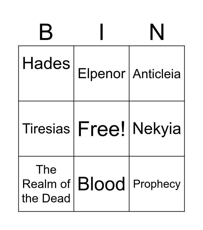 This bingo card has a free space and 8 words: Nekyia, Anticleia, Elpenor, The Realm of the Dead, Hades, Prophecy, Tiresias and Blood.