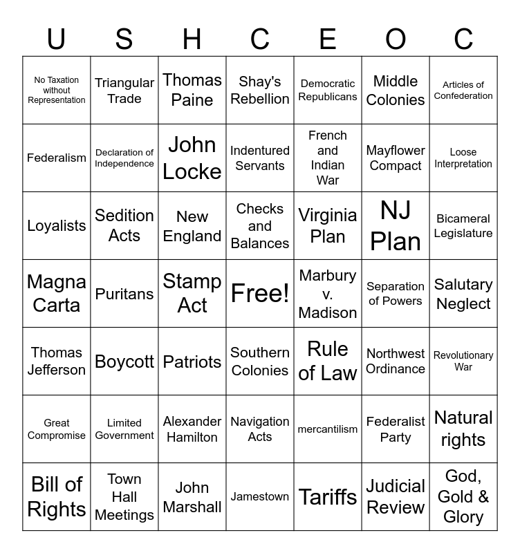 This bingo card has a free space and 48 words: mercantilism, Mayflower Compact, Jamestown, Puritans, New England, Salutary Neglect, Triangular Trade, Town Hall Meetings, Middle Colonies, Southern Colonies, Articles of Confederation, Shay's Rebellion, NJ Plan, Virginia Plan, Great Compromise, Separation of Powers, Federalism, Loose Interpretation, Federalist Party, Democratic Republicans, French and Indian War, Stamp Act, No Taxation without Representation, Declaration of Independence, Natural rights, John Locke, Bicameral Legislature, Bill of Rights, Checks and Balances, Sedition Acts, Judicial Review, Marbury v. Madison, Revolutionary War, Limited Government, Magna Carta, Rule of Law, Northwest Ordinance, Loyalists, Patriots, Alexander Hamilton, Thomas Jefferson, God, Gold & Glory, Thomas Paine, John Marshall, Indentured Servants, Navigation Acts, Boycott and Tariffs.
