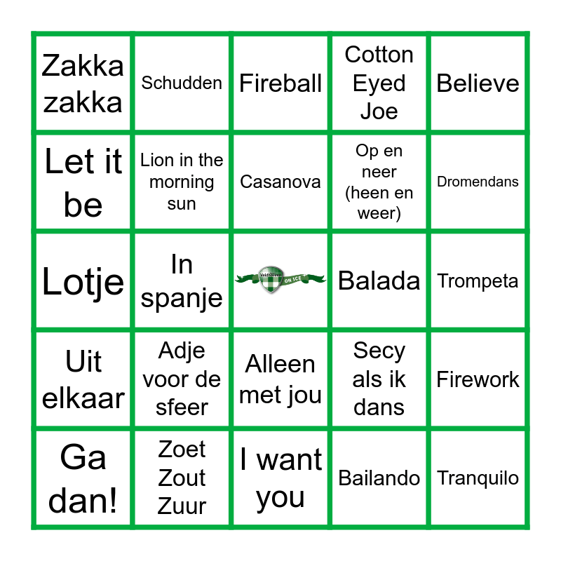 This bingo card has a free space and 44 words: Alles kan kapot, Tranquilo, Girls just wanna have fun, Ga dan!, M'n favoriet, Bailando, Fireball, Gimme gimme gimme, Believe, Zoet Zout Zuur, Cotton Eyed Joe, Balada, Alleen met jou, Adje voor de sfeer, Why tell me why, I want you, Waarom nou niet (kleuren), Lotje, I Gotta Feeling, Dromendans, Schudden, Mona Lisa, Shut up and dance, Zakka zakka, Walk on water, Trompeta, Euphoria, Pum Pum, Secy als ik dans, Uit elkaar, What makes you beautiful, Firework, Zomernacht in Griekenland, Kleine Vogel, In spanje, I want it that way, Unwritten, Thank you (not so bad), Casanova, Let it be, Op en neer (heen en weer), Danza Kaduro, Lion in the morning sun and Nachtenlang.