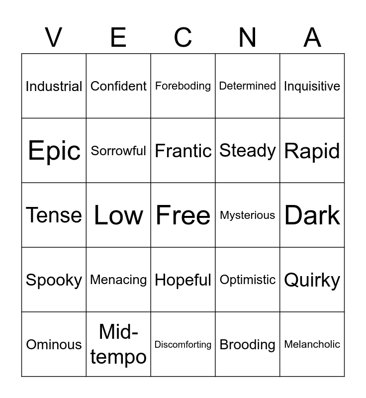 This bingo card has a free space and 45 words: Emotional, Melancholic, Light, Ominous, Resolute, Brooding, Foreboding, Dramatic, Inquisitive, Mid-tempo, Determined, Mysterious, Hopeful, Menacing, Intense, Discomforting, Curious, Tense, Disquiting, Rapid, Confident, Synth, Pulsating, Industrial, Triumphant, Dark, Tender, Dire, Optimistic, Spooky, Sinister, Quirky, Somber, Anxious, Enigmatic, Low, Unnerving, Eerie, Distorted, Frantic, Epic, Steady, Somber, Sorrowful and Wet Squelching.