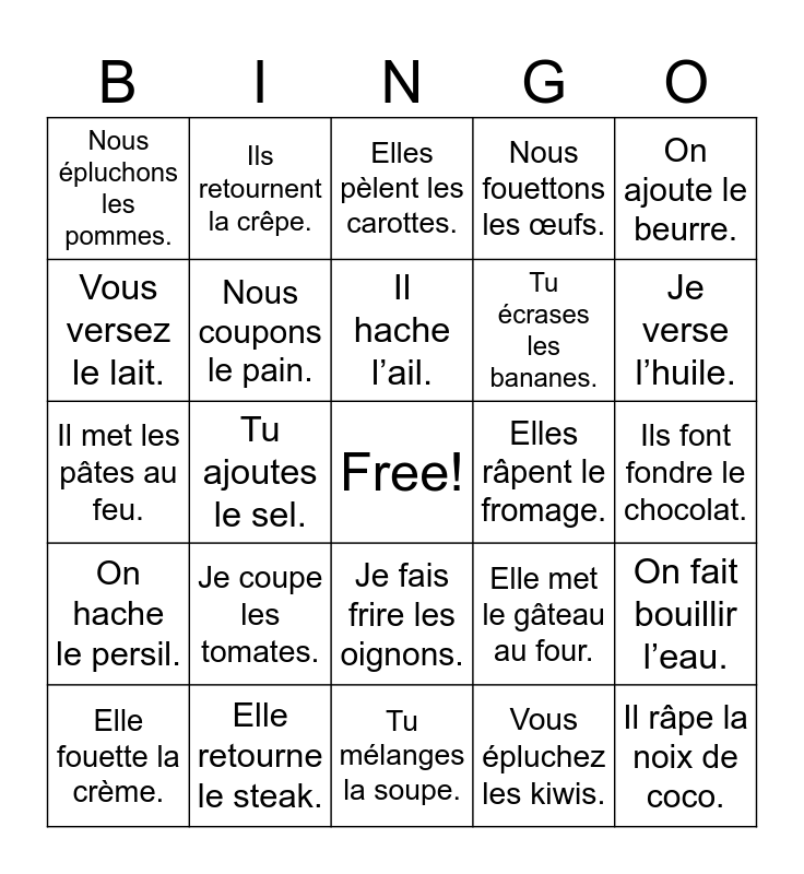 This bingo card has a free space and 25 words: Je coupe les tomates., Tu mélanges la soupe., Il hache l’ail., Elle fouette la crème., On ajoute le beurre., Nous épluchons les pommes., Vous versez le lait., Ils retournent la crêpe., Elles râpent le fromage., Je fais frire les oignons., Tu écrases les bananes., Il met les pâtes au feu., Elle met le gâteau au four., On fait bouillir l’eau., Nous coupons le pain., Vous malaxez la pâte., Ils font fondre le chocolat., Elles pèlent les carottes., Je verse l’huile., Tu ajoutes le sel., Il râpe la noix de coco., Elle retourne le steak., On hache le persil., Nous fouettons les œufs. and Vous épluchez les kiwis..