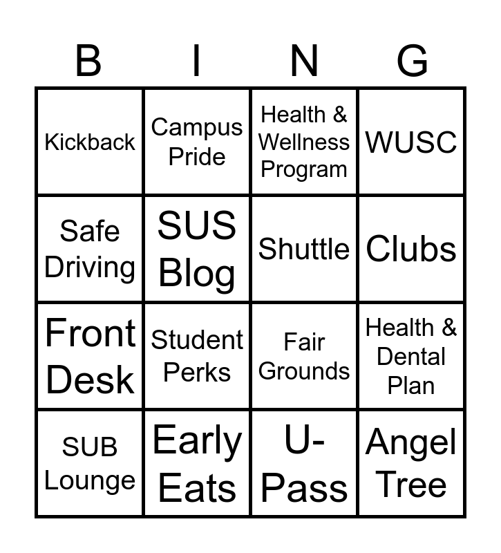 This bingo card has 16 words: Early Eats, Health & Dental Plan, Health & Wellness Program, Kickback, Front Desk, Campus Pride, Fair Grounds, U-Pass, Safe Driving, SUS Blog, SUB Lounge, WUSC, Student Perks, Clubs, Shuttle and Angel Tree.