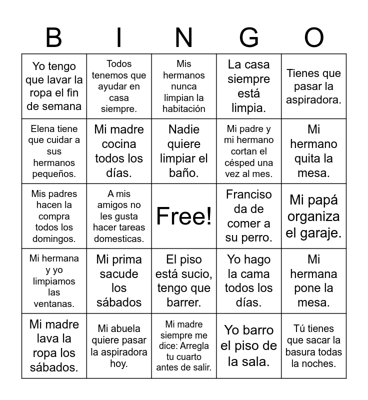 This bingo card has a free space and 24 words: Mi prima sacude los sábados, Mi abuela quiere pasar la aspiradora hoy., Nadie quiere limpiar el baño., Mi madre lava la ropa los sábados., Tienes que pasar la aspiradora., Yo tengo que lavar la ropa el fin de semana, Elena tiene que cuidar a sus hermanos pequeños., Todos tenemos que ayudar en casa siempre., Franciso da de comer a su perro., El piso está sucio, tengo que barrer., Mi padre y mi hermano cortan el césped una vez al mes., Mis padres hacen la compra todos los domingos., Yo hago la cama todos los días., Mi hermana pone la mesa., Mi madre cocina todos los días., Yo barro el piso de la sala., Mi papá organiza el garaje., Mis hermanos nunca limpian la habitación, Mi hermano quita la mesa., A mis amigos no les gusta hacer tareas domesticas., Tú tienes que sacar la basura todas la noches., Mi hermana y yo limpiamos las ventanas., La casa siempre está limpia. and Mi madre siempre me dice: Arregla tu cuarto antes de salir..
