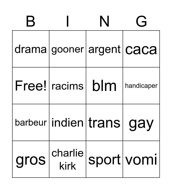 This bingo card has 16 words: charlie kirk, gay, argent, drama, barbeur, gooner, trans, sport, Free!, racims, gros, caca, indien, handicaper, blm and vomi.