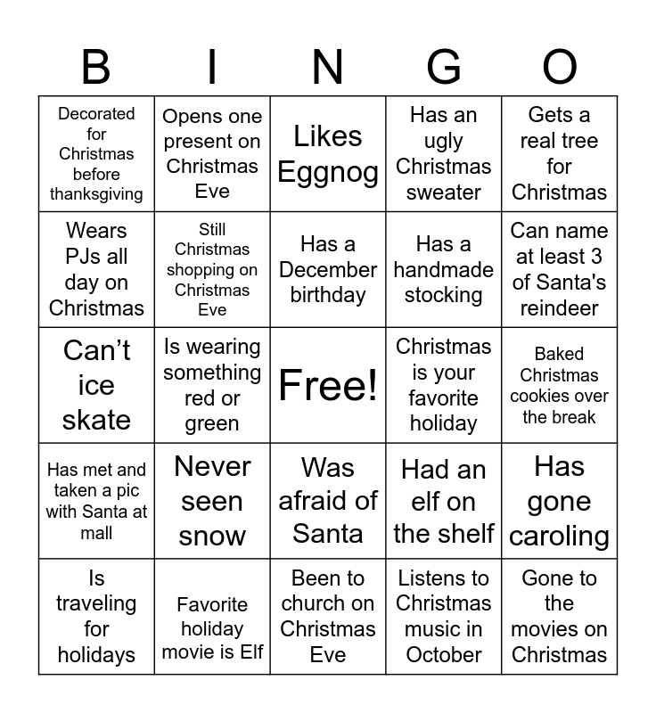 This bingo card has a free space and 24 words: Never seen snow, Favorite holiday movie is Elf, Has a December birthday, Is traveling for holidays, Gets a real tree for Christmas, Decorated for Christmas before thanksgiving, Wears PJs all day on Christmas, Opens one present on Christmas Eve, Christmas is your favorite holiday, Was afraid of Santa, Has a handmade stocking, Can’t ice skate, Had an elf on the shelf, Has gone caroling, Still Christmas shopping on Christmas Eve, Listens to Christmas music in October, Baked Christmas cookies over the break, Likes Eggnog, Can name at least 3 of Santa's reindeer, Is wearing something red or green, Gone to the movies on Christmas, Has met and taken a pic with Santa at mall, Has an ugly Christmas sweater and Been to church on Christmas Eve.